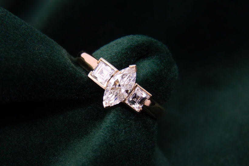 In questo anello che vedete i nostri mastri orafi hanno giocato con le classiche forme del trilogy, realizzando un anello raffinato e affascinante con diamante centrale taglio navette e diamanti laterali taglio princess.