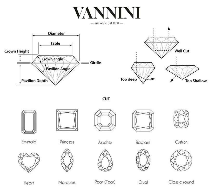 Come vedremo a breve, infatti, un diamante di dimensioni maggiori ma con molte inclusioni (imperfezioni interne), brutto colore o un taglio mal eseguito potrebbe risultare meno brillante e meno desiderabile rispetto a un diamante più piccolo ma di qualità superiore. - Cut (Taglio): Il taglio di un diamante ne determina la brillantezza. Un buon taglio riflette la luce in modo ottimale, esaltando la bellezza naturale della pietra. Tra i tagli più popolari e apprezzati troviamo il taglio brillante, noto per la sua capacità di massimizzare la luce riflessa grazie alle sue faccette. Questo taglio, ampiamente diffuso, si distingue a sua volta in diverse tipologie, come il classico, l’Amsterdam e l’Anversa.