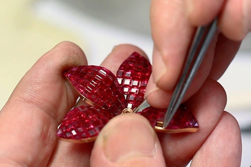 Questa tecnica viene utilizzata per nascondere completamente il metallo che tiene in posizione le gemme. Le pietre vengono disposte in un binario metallico senza spazi tra loro, creando un affascinante effetto mosaico. Questa tecnica è prevalentemente impiegata nella realizzazione di anelli.