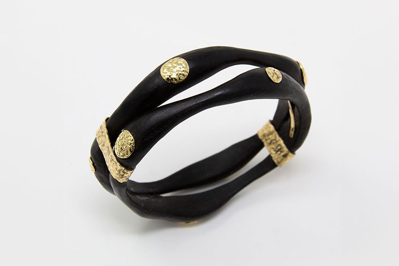Un altro bracciale che ti consigliamo è il nostro bracciale Aimé noir. Questo doppio bracciale è realizzato artigianalmente, con una base in ebano, impreziosita da eleganti fascette e tondi in oro giallo martellato.