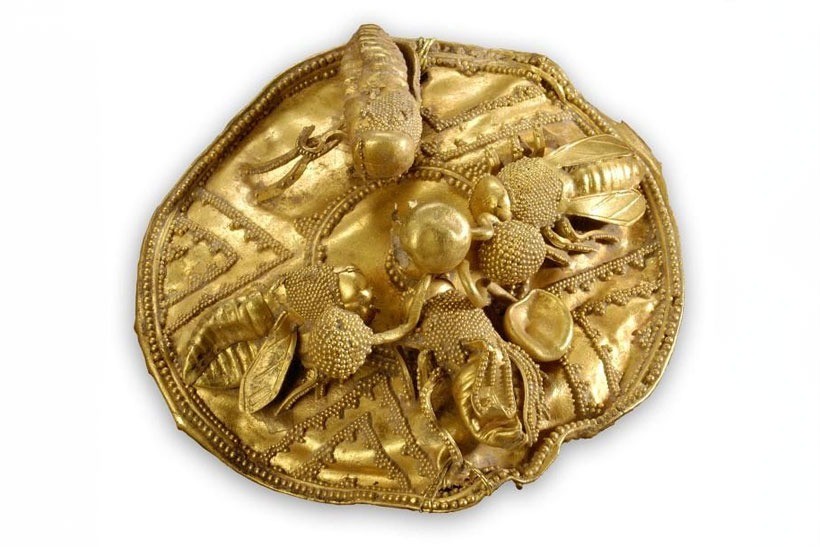 Un esempio di creazione in oro 24 carati realizzata nell'antica Grecia. Gioielli e oggetti preziosi come questo, caratterizzati dalla presenza di piccole sfere, vengono realizzati proprio frazie alla malleabilità dell'oro puro.