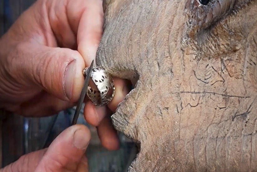 Rifinitura artigianale: il semilavorato viene perfezionato attraverso tecniche tradizionali come incisione a bulino, per aggiungere dettagli decorativi minuziosi o traforo con seghetto, che consente di creare motivi elaborati e giochi di luce.
